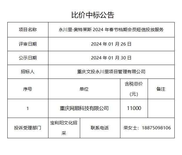 永川里·奥特莱斯2024年春节档期会员短信投放服务比价中标公告