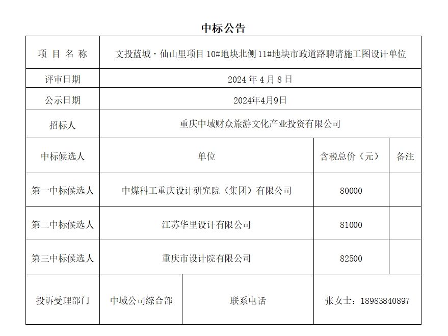 文投蓝城·仙山里项目10#地块北侧11#地块市政道路聘请施工图设计单位中标公告
